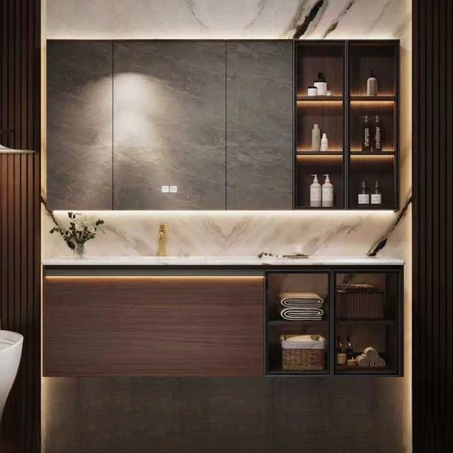Mobile da bagno di lusso personalizzato in legno massello con ripiano in pietra sinterizzata e cassetto mobile e ripiano di vanità