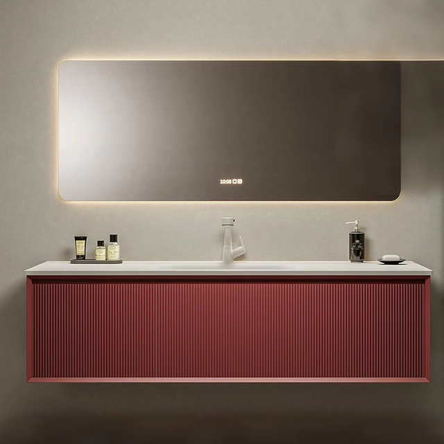 ミニマリストソリッドウッド豪華な浴室バニティセットスマートミラー段ボールパネル壁に取り付けられたラッカー仕上げアパート水